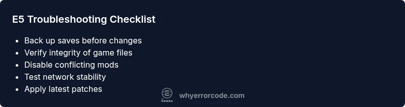 E5 is typically due to corrupted files, mod conflicts, or server problems. Start with quick checks and move step by step.