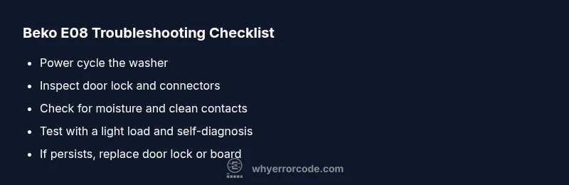 beko error code 08 indicates a fault detected by the washer’s electronic control system, usually related to door lock integrity or load sensing. The quick fix is to power cycle the machine, check the door latch and wiring harness, and run a basic diagnostic test. If the code persists, stop and contact a professional technician.