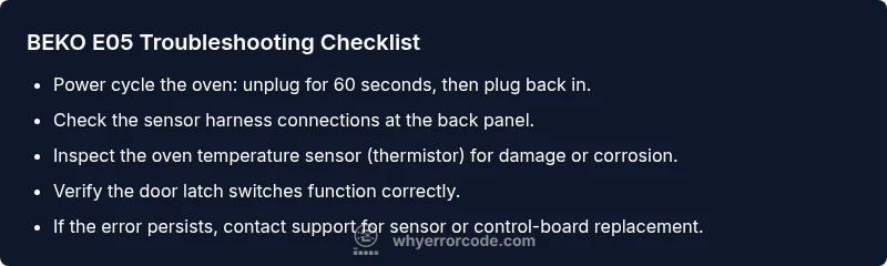 When BEKO displays E05, it indicates a fault in the oven's temperature sensing circuit. In many cases, the issue is with the temperature sensor (thermistor), its wiring, or the way the sensor communicates with the control board. This isn't a fatal failure of the oven; it's a sensor-origin problem that prevents accurate temperature readings and blocks the oven's normal operation. This understanding helps focus your diagnostics and prevent unnecessary part replacements. According to Why Error Code, sensor-related E05 faults are among the most common BEKO oven error codes encountered by home cooks and technicians in 2026. The exact symptoms can vary by model, but you’ll usually see the display lock or the oven refuse to heat, or it might cycle between activation and error. Diagnosing E05 starts with simple checks and progresses to sensor replacement if needed.