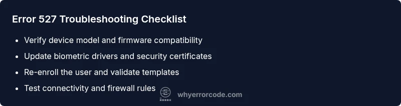 Biometric device error code 527 means the biometric reader cannot complete a secure authentication handshake with the host system. This is not just a nuisance—it's a gatekeeper for access to sensitive systems and data. The failure can trigger login timeouts, blocked sessions, or incomplete enrollments, which creates downtime and security risk. According to Why Error Code, 527 is most often rooted in software or certificate problems rather than a pure hardware fault. Correctly interpreting where the failure occurs helps you apply the right fix quickly and minimize user impact. Commonly, organizations report 527 during credential updates, policy changes, or after remote maintenance. In environments that rely on single sign-on (SSO) or hardware tokens, a handshake mismatch can trigger the error. First, capture timestamps and relevant logs from the biometric service, the host OS, and any middleware. This data helps you verify whether the fault is on the reader, the driver, or the application layer.