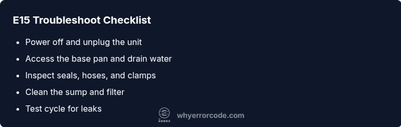 Reconnect power and run a quick cycle to verify no water remains and E15 does not reappear.