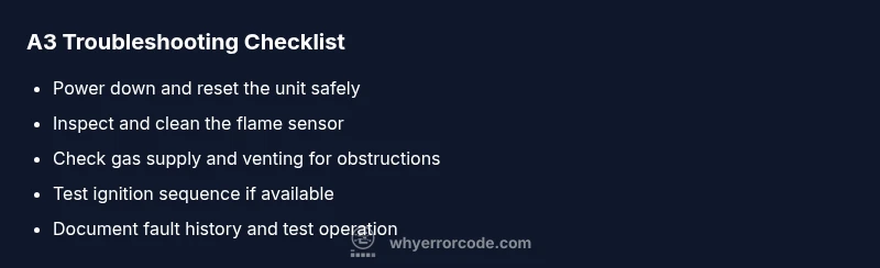 Sharp on-unit indicators (LEDs, fault codes, and status lights) help diagnose A3. Bosch systems often relay A3 alongside other indicators that point toward ignition timing, flame sensing, or sensor wiring issues. If the heat call fails, the unit may enter a fault loop and repeatedly show A3 until resolved. Understanding the precise sequence your model uses is essential; always consult the owner’s manual or Bosch’s official support pages for your exact serial family. In general, A3 is not a universal hardware failure – it is a safety-first alert that typically means a sensor or ignition path needs attention. For technicians, documenting when the fault first appeared and any concurrent noises or smells can accelerate a resolution. According to Why Error Code, focusing on sensor health and safe restart procedures yields the best initial outcomes.