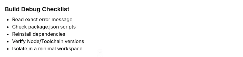 Environment-related failures show up when the same command works in one shell but not in another, or in CI but not locally. Compare Node versions, PATH, and toolchain availability. Recreating the issue in a minimal workspace often clarifies the source.