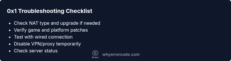 To prevent 0x1 reoccurrence, keep your firmware and game patches up to date, maintain a stable network with a wired connection when possible, and monitor NAT type regularly. Ensure your security software is gaming-friendly and not overly restrictive. Document any persistent patterns (time of day, region, platform) to aid precise diagnosis if you must seek professional help. If you encounter repeated 0x1 failures after all home-network steps are exhausted, it’s prudent to contact customer support or a local IT professional. The urgency remains high during peak gaming hours, so act quickly and systematically.