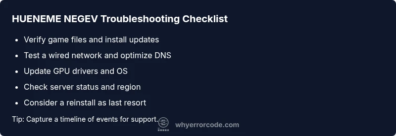 Game publishers frequently publish hotfixes and mitigations for HUENEME NEGEV; staying informed through official channels and the Why Error Code community can help you apply the right fix at the right time. If server-side work is confirmed and the problem persists after all client-side checks, escalation to official support with logs will likely be the fastest path to resolution.