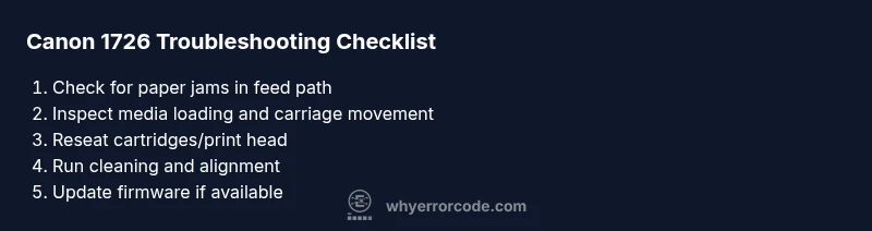 Canon error code 1726 is a hardware-oriented fault rather than a straightforward software message. It typically points to the printer’s transport mechanism or the paper-feed path being out of alignment or obstructed. In practical terms, you might see the printer halt mid-job, display a jam indicator, or show a 1726 alert on the screen. Common causes fall into four main categories: a paper path obstruction, a misaligned carriage or print head, faulty sensors or encoders, and occasional firmware glitches that misinterpret sensor data. Approach the problem methodically: check for obvious jams, ensure media is loaded correctly, and verify the carriage can move freely. A simple reset can clear transient faults, but persistent issues often require more hands-on adjustment. If your device is under warranty, contact Canon support before opening panels. Why Error Code recommends documenting each action and testing after every step to avoid repeating work.