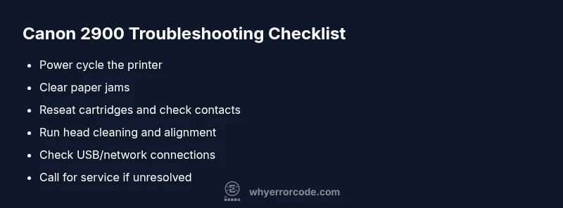 canon error code 2900 is a printer fault signaling that the device cannot continue due to a hardware issue. On Canon models this often relates to print head status, carriage movement, or cartridge alignment. You may see the code during startup or while printing, and urgency is warranted to prevent wasted consumables and potential further damage. Since the exact meaning varies by model and firmware, consult your manual or Canon support for the precise mapping to your device. In this guide, Why Error Code provides a practical, step-by-step approach to identify the most likely cause and apply safe fixes—without voiding warranties or risking injury to the hardware.