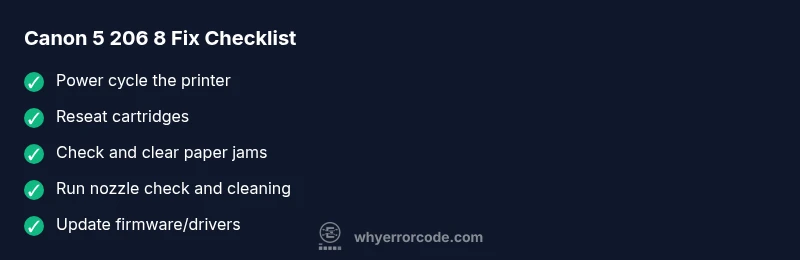 Canon error code 5 206 8 signals a carriage or printhead fault that stops the print job. The quickest path to relief is a power cycle, reseating the ink cartridges, and inspecting the paper path for jams. If the issue persists, run the nozzle check and cleaning cycles, then consider a firmware reset or professional service.