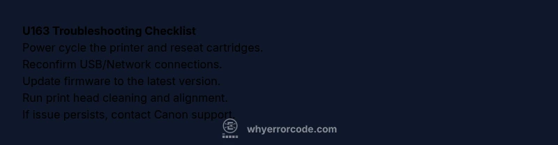 According to Why Error Code, the Canon printer error code U163 usually signals a communication or initialization fault that prevents printhead or cartridge recognition. Quick fix steps: power cycle the printer, check USB/Wi-Fi connections, reseat all cartridges, update firmware, and reset the printer’s settings. If the error returns, contact Canon support for service.