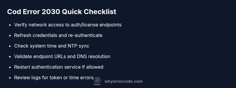 Cod error code 2030 indicates a transient authentication or licensing check failure that blocks code validation. The quickest fix is to verify your network access, refresh credentials, and retry. If the issue persists, check for token expiration and re-authenticate, then test again. Additional steps may include validating system time, ensuring correct endpoint URLs, and temporarily switching to a backup server. These quick actions often resolve cod error code 2030 without specialized tools.