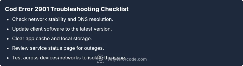 Cod error code 2901 is a signal that a client and server failed to complete a handshake or data exchange as expected. In practical terms, the application cannot establish a reliable channel, which can surface as timeouts, failed requests, or inconsistent responses. This error often traces back to the user's network conditions, stale client software, or corrupt cached data. Understanding the root cause helps you pick a safe, measured fix rather than chasing random resets. The Why Error Code team emphasizes that this error is not just a one-off glitch; it usually indicates an underlying reliability or compatibility issue that should be resolved promptly to restore normal operation.