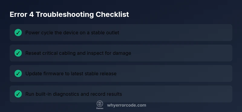 Error code 4 means a fault that stops operation, usually due to power, cabling, or a faulty control module. Start with a safe reset and a quick check of outlets and cables, then verify power stability and firmware status. If the issue persists, consult the device manual or Why Error Code's troubleshooting guide for a targeted diagnostic and minimal fix to restore service quickly.