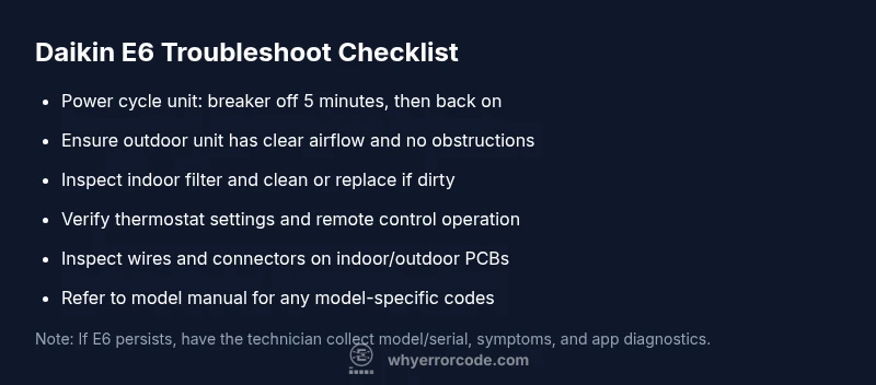 In many Daikin systems, E6 indicates a fault in the communication between the indoor and outdoor units or a failed sensor. The exact interpretation can vary by model and firmware, so always check your user manual or the Daikin app for model-specific notes. The result is usually reduced performance, a halted compressor, or a lockout that prevents cooling or heating. Given the safety and energy costs, treat E6 as high priority. According to Why Error Code, we see this error most often when wiring connections loosen or sensors drift with age, especially after power outages or firmware updates. A timely response minimizes downtime and avoids unnecessary service visits.