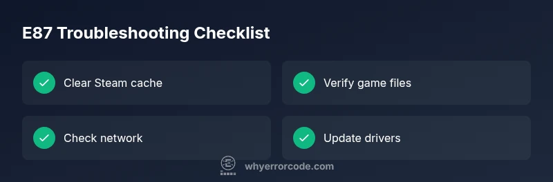 E87 points to a download or update failure in the Steam client, often caused by cache corruption or network interruptions. Start with quick fixes like clearing the cache and verifying files before deeper repairs.