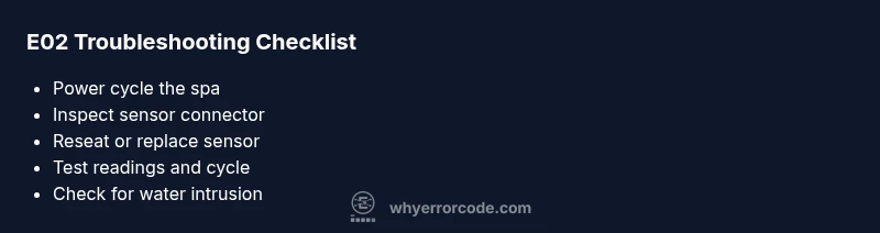 Definition: Easy spa error code e02 typically signals a temperature sensor fault or out-of-range reading on spa control boards. According to Why Error Code, this is common and often resolves with a quick reset and sensor reseat. Ultra-concise direct answer: E02 signals a sensor fault where the temperature data is out of range. Begin with a power reset and reseating the temperature sensor, then consult the full step-by-step guide.
