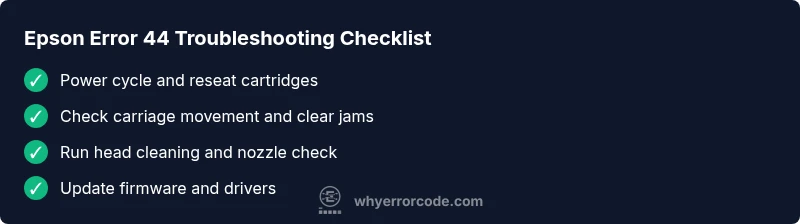 Epson printer error code 44 indicates a hardware fault or sensor issue that stops printing. The quickest fix is to power cycle the printer, reseat all ink cartridges, and run a printer head cleaning from the control panel. If the error persists, check for paper jams, update firmware, and run a diagnostic print. If unresolved, contact Epson support.