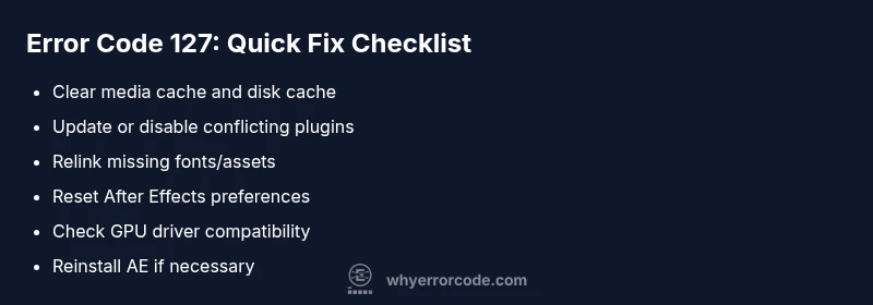 Error code 127 Adobe After Effects indicates a load or runtime failure often caused by plugins, scripts, or cached data. The fastest fix is to clear the media cache, update or disable conflicting plugins, and reinstall if necessary. Always ensure compatible GPU drivers and fonts; if the error persists, reset preferences and perform a clean install.