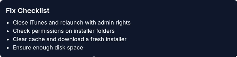 - Run the installer as administrator: Right-click the setup file and choose Run as administrator, then retry the install/update. - Temporarily disable antivirus and firewall protections: Turn off real-time protection briefly, then run the installer again. Re-enable protection immediately after the attempt. - Clear installer cache and temporary files: Delete temporary directories used by the OS and iTunes installer; restart the system before retrying. - Check disk space and file permissions: Ensure there is adequate free space and that the destination folder is not read-only. - Use a fresh official installer: Redownload the iTunes package from the official source to avoid a corrupted file.