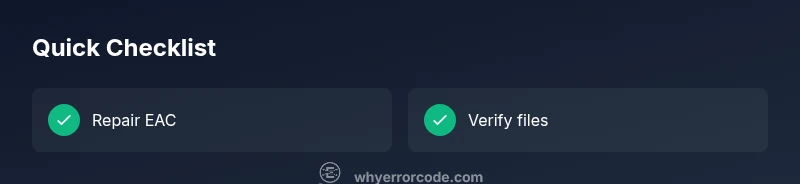- Run the game as administrator to ensure the anti-cheat kernel driver can load during startup. This often resolves permission-related initialization failures for error code 30005 easy anti cheat. 2. Repair the Easy Anti-Cheat installation from the game’s launcher or the EAC installer in the game directory. Choose Repair and reboot if prompted. 3. Verify game files through the platform (Steam, Epic, etc.) to replace any corrupted EAC components. 4. Update GPU drivers and install the latest Windows updates to align with the EAC kernel module expectations. 5. Check for overlays or security software that could block EAC; temporarily disable them and test. 6. If all else fails, reinstall Easy Anti-Cheat from the game launcher. Tip: perform these steps in a clean boot environment if you continue to see errors.