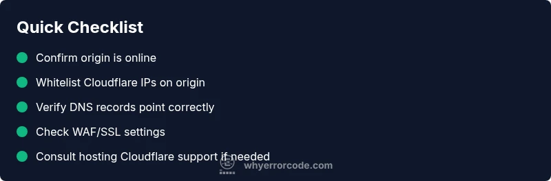 Quick fixes include confirming origin online, ensuring Cloudflare IPs aren’t blocked by firewalls, and validating that DNS records point to the correct origin IP. If the issue persists, follow the diagnostic steps in our guide.