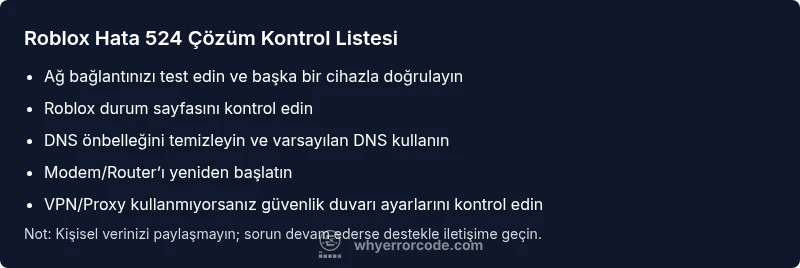 Error code 524 Roblox ne demek? Bu hata, Roblox ile oyun istemcisi arasındaki bağlantı kurulamaması veya zaman aşımı nedeniyle ortaya çıkar. Genelde ağ sorunları, DNS/yönlendirme hataları veya Roblox tarafı geçici kesintilerle ilişkilidir. Aşağıdaki hızlı adımlar, çoğu durumda hatayı kısa sürede gidermenize yardımcı olur.