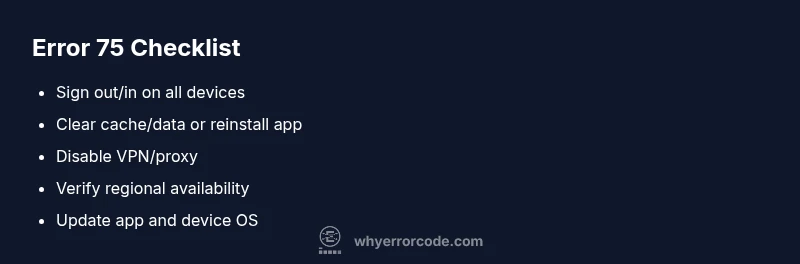 Error code 75 typically indicates a playback authorization problem or regional restriction affecting streaming access. It’s often caused by a signed-in session issue, an entitlement mismatch, or a VPN/region conflict.