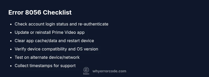 Error code 8056 prime video usually signals an authorization, DRM, or playback service issue on Prime Video. The quick fix is to re-authenticate your account, verify your device and network, update or reinstall the Prime Video app, and try an alternate device. If the error persists, sign out all sessions, clear cache, restart the device, and contact support.