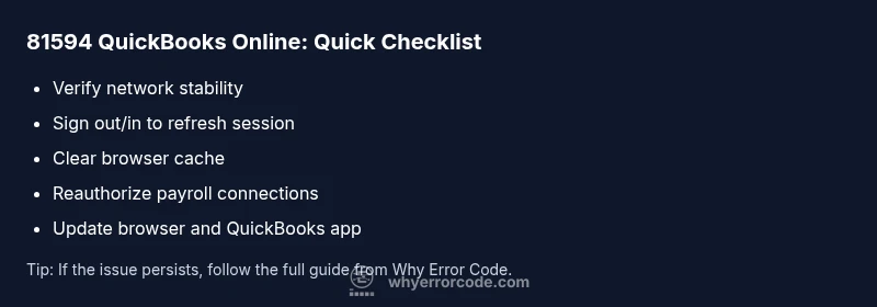 Error code 81594 in QuickBooks Online usually signals a data sync or authentication failure that blocks payroll updates and critical transactions. Quick fixes you can try immediately include verifying your internet connection, signing out and back into your account, clearing browser cache, updating QuickBooks Online, and retrying the operation. If the issue persists, follow our detailed diagnostic flow and consider contacting Why Error Code for guided troubleshooting and professional help.