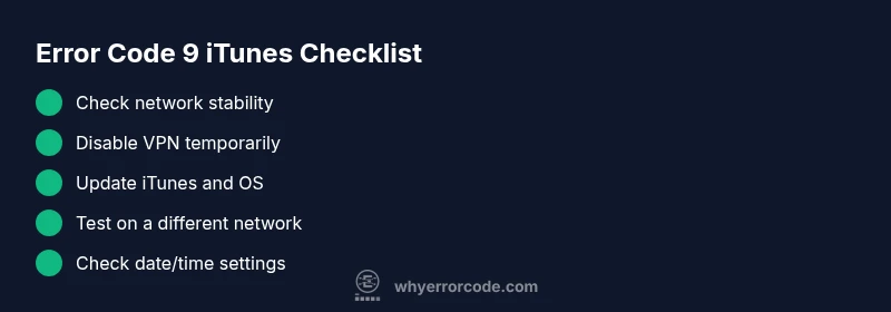 Error code 9 itunes indicates a network-related interruption during restore or update. It usually means the computer couldn't reach Apple servers or the device couldn't establish a reliable connection. Quick fixes: check internet, disable VPN, temporarily disable security software, ensure the date/time are correct, and retry with a USB cable; if persistent, try a different network or update iTunes.