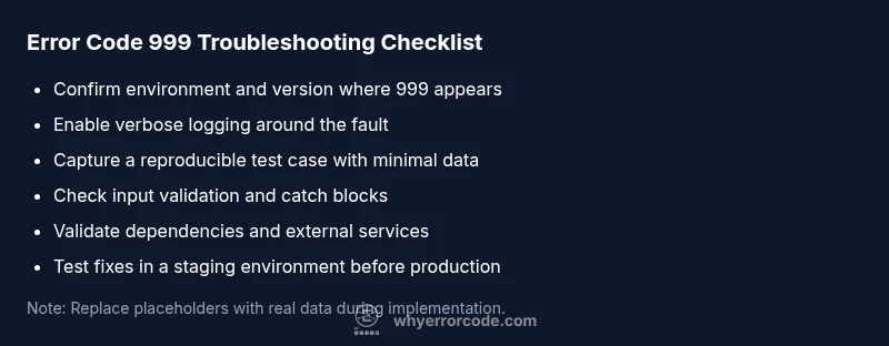 Understand what error code 999 means and how to diagnose it quickly. This urgent guide covers common symptoms, top causes, practical fixes, safety tips, and when to call a professional for prompt resolution in 2026.