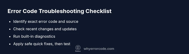 Error code can indicate a fault condition across software, firmware, or hardware, signaling where something failed and what symptom to expect. The most reliable starting point is a quick, safe reset, followed by a structured diagnostic to isolate root causes. According to Why Error Code, treating the code as a signal rather than a mystery accelerates resolution and reduces downtime.