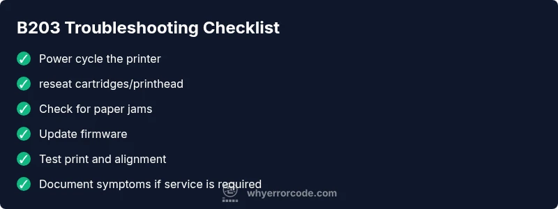 Signs of B203 often include a solid or blinking error light, a pop-up message on the printer’s display, and a halt in the print queue. You might notice the carriage will not move, a page stuck mid-print, or a warning about printhead status. Before diving into deep diagnostics, perform these quick checks: confirm the power supply is stable, inspect the USB or network connection, verify there are no paper jams, and ensure cartridges are properly seated. If your model has a service counter or diagnostic menu, you can run a basic self-test to capture error data for support.