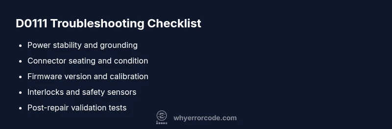 D0111 can stem from both hardware (loose connections, aging boards) and software (firmware corruption or calibration data). A methodical diagnostic flow helps differentiate.