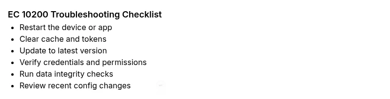 EC 10200 is a generic error signaling a data integrity or configuration fault across systems. Start with resets and cache refreshes, then check for updates.