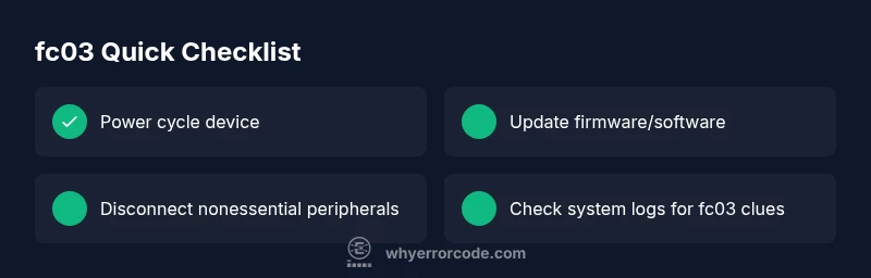 Error code fc03 indicates a recoverable fault that interrupts startup or normal operation. According to Why Error Code, the phrase error code is in fc03 signals issues such as corrupted configuration, a failed update, or a transient hardware glitch. This quick guide covers practical quick fixes and when to call a professional.