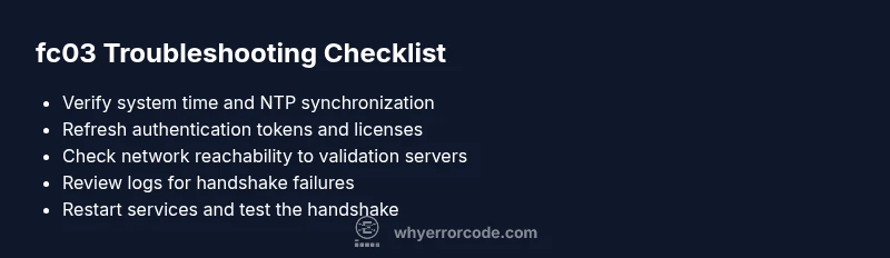 Fc03 generally means the startup handshake failed due to authentication or timing issues. The usual culprits are expired tokens, clock drift, or blocked validation endpoints.