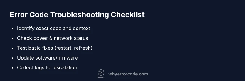 Quick path: 1) Identify the exact error code and when it appears. 2) Check quick fixes first (restart, refresh the page, reconnect the device, update software). 3) Inspect common causes (network issues, permissions, outdated drivers). 4) Apply the most likely fix and re-test. If it persists, collect logs and escalate with your system details for deeper diagnosis.