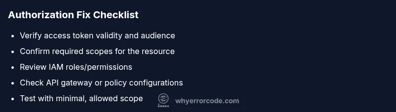 - Reproduce the error with a simple, auditable request to the same resource to confirm the failure. 2) Open the identity provider or credential store and check the token or key for expiry, audience, and scopes. 3) Refresh or re-authenticate and obtain a new access token or key. 4) Validate that the token contains the required scopes and is issued for the correct audience. 5) Review IAM or role policies to ensure they include the needed permissions for the requested resource. 6) If you’re using an API gateway or proxy, verify that the gateway policy permits your operation and that the route matches the token’s scopes. 7) Test again with the updated credentials using a known-good client, and monitor the response for any residual denials. 8) Review recent changes to policies or configurations that could have unintentionally denied access.