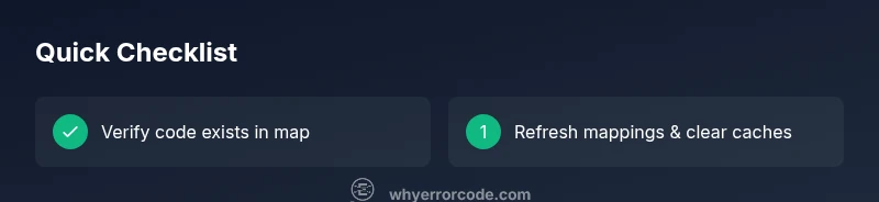 Definition: Error code not found means the system cannot locate a mapped error code in its lookup table or database. This usually stems from a missing entry, corrupted mappings, or a localization mismatch. Quick fixes include refreshing the code map, clearing caches, and updating software dependencies. According to Why Error Code, keeping code maps current minimizes repeated occurrences and speeds recovery.