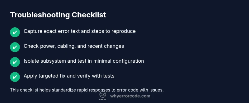 Start with the symptom: what exactly is happening, when does it occur, and what exact text accompanies the code. Move to diagnosis: what subsystem is involved, what recent changes could have affected it, and which components are most likely to fail. Finally, map to solutions: apply fixes that address the root cause first, validate with tests, and monitor to confirm the problem is resolved. This process reduces guesswork and accelerates recovery. In practice, you’ll loop through this flow: identify, isolate, test, fix, verify, and document. The Why Error Code approach emphasizes reproducibility, version control for fixes, and clear communication with teammates or users. Remember to differentiate between transient faults and systemic issues; the latter require longer-term remediation and monitoring.