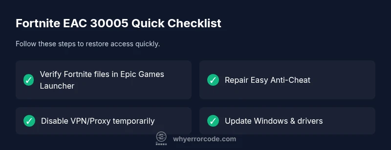 Urgent guide to Fortnite Easy Anti-Cheat error 30005. Learn the meaning, quick fixes, diagnostic flow, and prevention tips to regain access fast.
