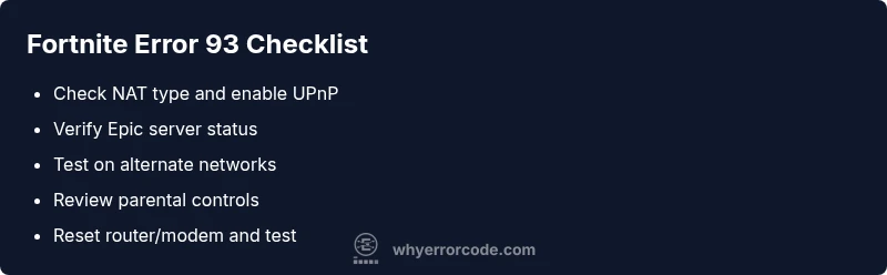 Fortnite error code 93 means you’re unable to join a party, typically due to network restrictions or server issues. In most cases, you can fix it quickly by checking your NAT type, testing another network, and ensuring your Epic account has no parental controls blocking invites. If problems persist, follow the step-by-step fixes below for rapid results.