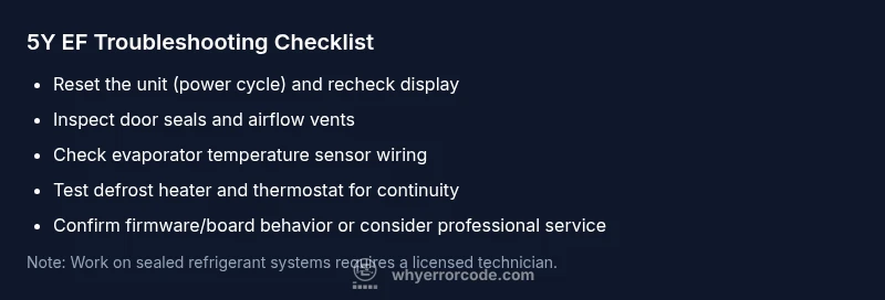 The frigidaire refrigerator error code 5y ef indicates a fault detected by the control board related to temperature sensing or the defrost system. This is not a universal message across all models, but the common thread is that a sensor or defrost dysfunction is triggering the fault. According to Why Error Code, diagnosing this error quickly minimizes food spoilage and wasted energy. When you see 5y ef, the first step is to rule out transient glitches and confirm that the problem persists after a power cycle. A calm, methodical approach—starting with a reset and then moving to sensor checks—often resolves the issue without costly repairs.