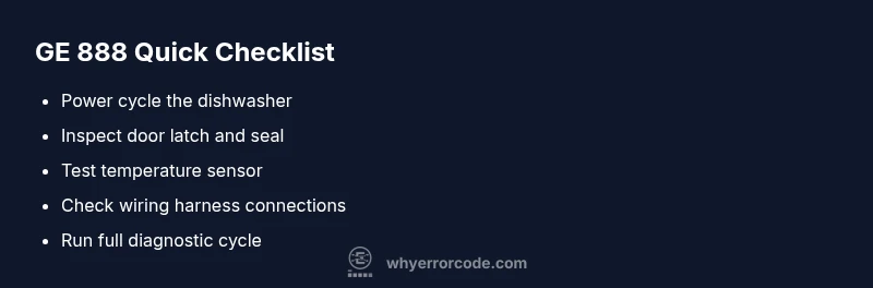 Symptom: GE dishwasher error code 888 appears and the cycle stops. Possible causes (in order of likelihood): - Faulty door latch (high) - Faulty temperature sensor (medium) - Damaged wiring or connectors (low). Quick fixes in sequence: - Reset power and reseat connectors (easy) - Test/replace temperature sensor (easy) - Inspect door latch and replace if needed (medium) - Replace control board or heater if required (hard).