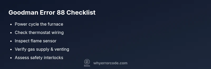 goodman furnace error code 88 typically signals a safety or control fault stopping the furnace from operating. It’s not a single mechanical failure but a generic fault code that requires diagnostic steps. Immediate quick fixes include: power-cycling the furnace, verifying thermostat wiring and settings, inspecting the flame sensor and ignition sequence, and confirming gas supply and venting. If unresolved, call a licensed HVAC technician.