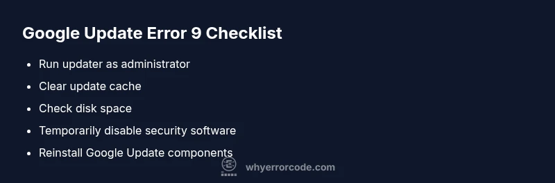 Start with the simplest steps and escalate only if needed. Run Google Update as an administrator to ensure the updater has full file access. Clear the update cache and restart the updater. Check available disk space and temporarily disable antivirus or firewall if they might be blocking the process. Finally, reinstall the Google Update helper to refresh components. These steps are fast, low-risk, and commonly resolve error code 9 without touching critical system settings.