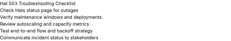 A 503 means Hats is temporarily unavailable. Retry with backoff and check status pages while investigating capacity or routing problems.