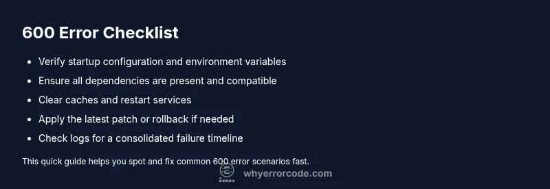 According to Why Error Code, error code 600 is not tied to a single, universal standard. Instead, it signals a general failure during startup or initialization at the application or service layer. This means the system attempted to boot, load essential components, or establish critical dependencies but encountered a fatal condition that prevented normal operation. The impact can range from a brief service unavailability to a full outage, depending on where the failure occurs and what safeguards are in place. Recognizing that 600 is a broad indicator helps teams approach diagnosis with a structured mindset rather than chasing a single, narrow fault. In practice, you’ll see 600 when a startup checkpoint fails before the service can expose its core functionality.