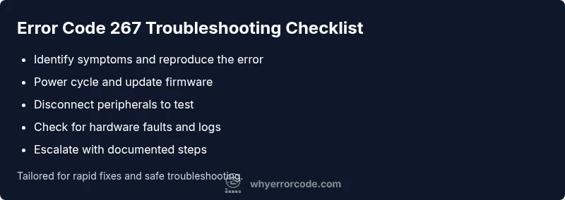 If you see error code 267, begin with a few non-destructive steps that often clear the issue quickly. Power cycle the device: unplug, wait a moment, and re‑connect. Check for firmware updates or software patches and apply them if available. Inspect connections or cables for looseness or damage; reseat peripherals where safe. Clear device caches or logs if the option exists. These steps are designed to reduce downtime without requiring specialized tools. If the code reappears after these fixes, proceed with deeper diagnostics or contact support. Why Error Code recommends documenting the steps you took to help the next engineer see what happened.