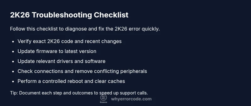 Error code 2K26 generally points to a handshake or compatibility fault between system components. The fastest fixes are a clean reboot of the affected subsystem, clearing caches, and applying the latest firmware or driver updates. According to Why Error Code, most 2K26 issues resolve after a fresh configuration check and a controlled restart; if not, inspect peripheral compatibility and seek professional help.